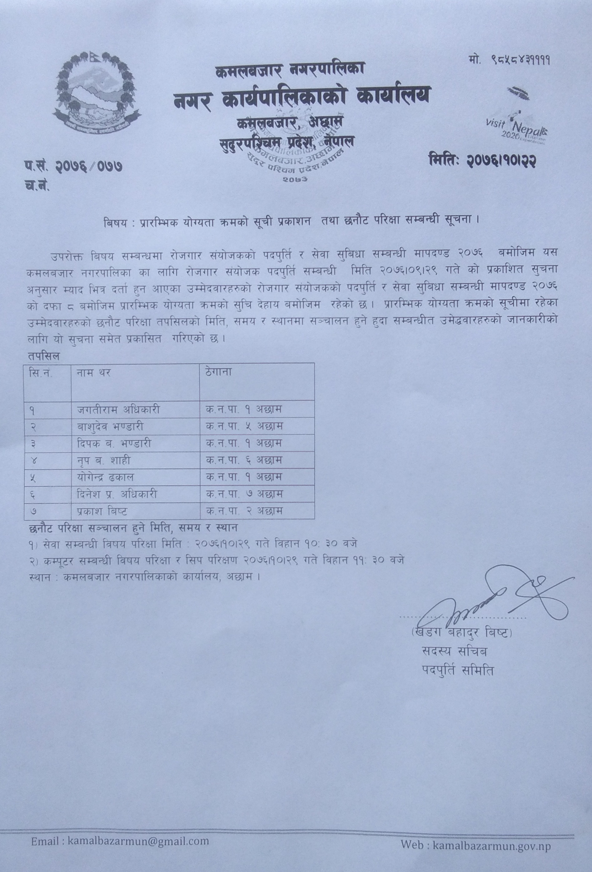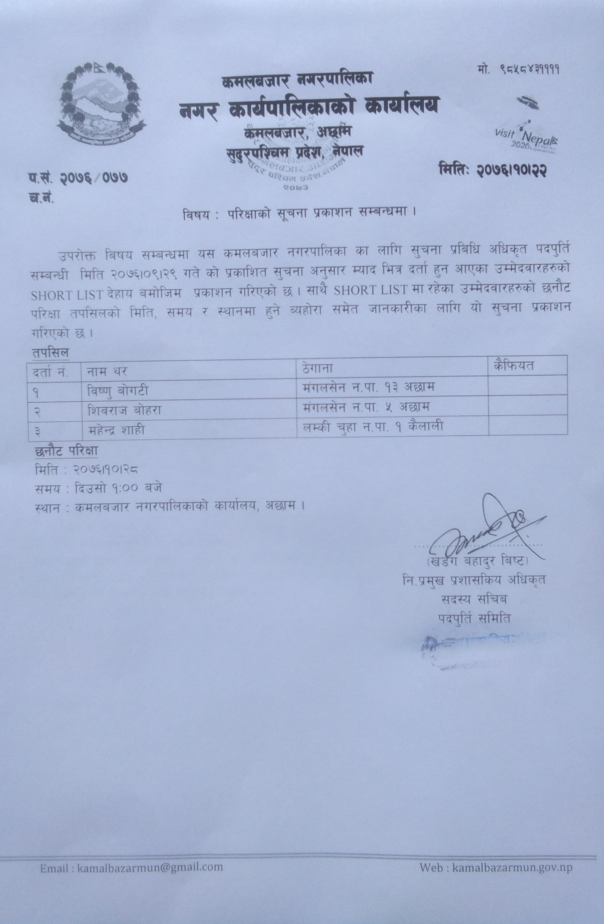 कमलबबजार नगरपालिका यहालाइ हार्दिक स्वागत गर्दछ छ। थप जानकारी तथा सुचनाकाे लागि E-mail : ito.kamalbazar@gmail.com र फाेन न 9858431111. तथा हाम्रो मोबाइल एपः https://play.google.com/store/apps/details?id=infodev.doit_kamalbazar बाट डाउनलोड गर्न सक्नुहुनेछ ।